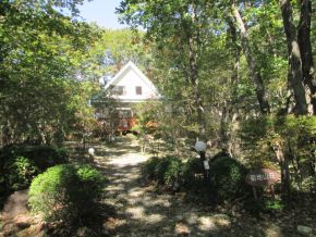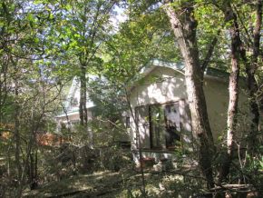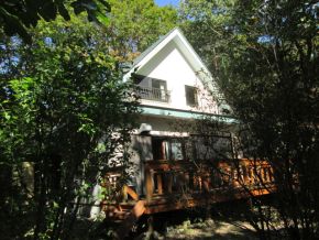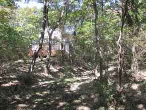 対象不動産は緩やかな南斜面で、画地中程が大きく窪んでいます。建物はこのような地勢に配慮し、画地西側奥に2階建ての主たる建物、東側にお客様用(所有者による)離れを建て、渡り廊下で綱くような造りとなっています。敷地は広いので、デッキ等からの景色は十分自然が感じられ…自然に触れ別荘を楽しむのに十分すぎる環境です(敷地には各所にイス、テーブルなど置かれています。)。