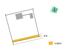 南側、幅員約3.8m未舗装道(42条1項3号道路-既存道路)・画地裾辺で接面 |