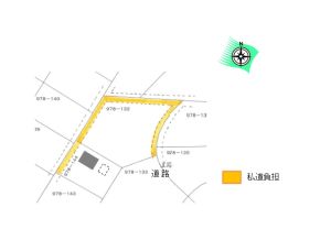 北西側、幅員約4.5m舗装私道(他北・東側道)ほぼ等高位で接面 |